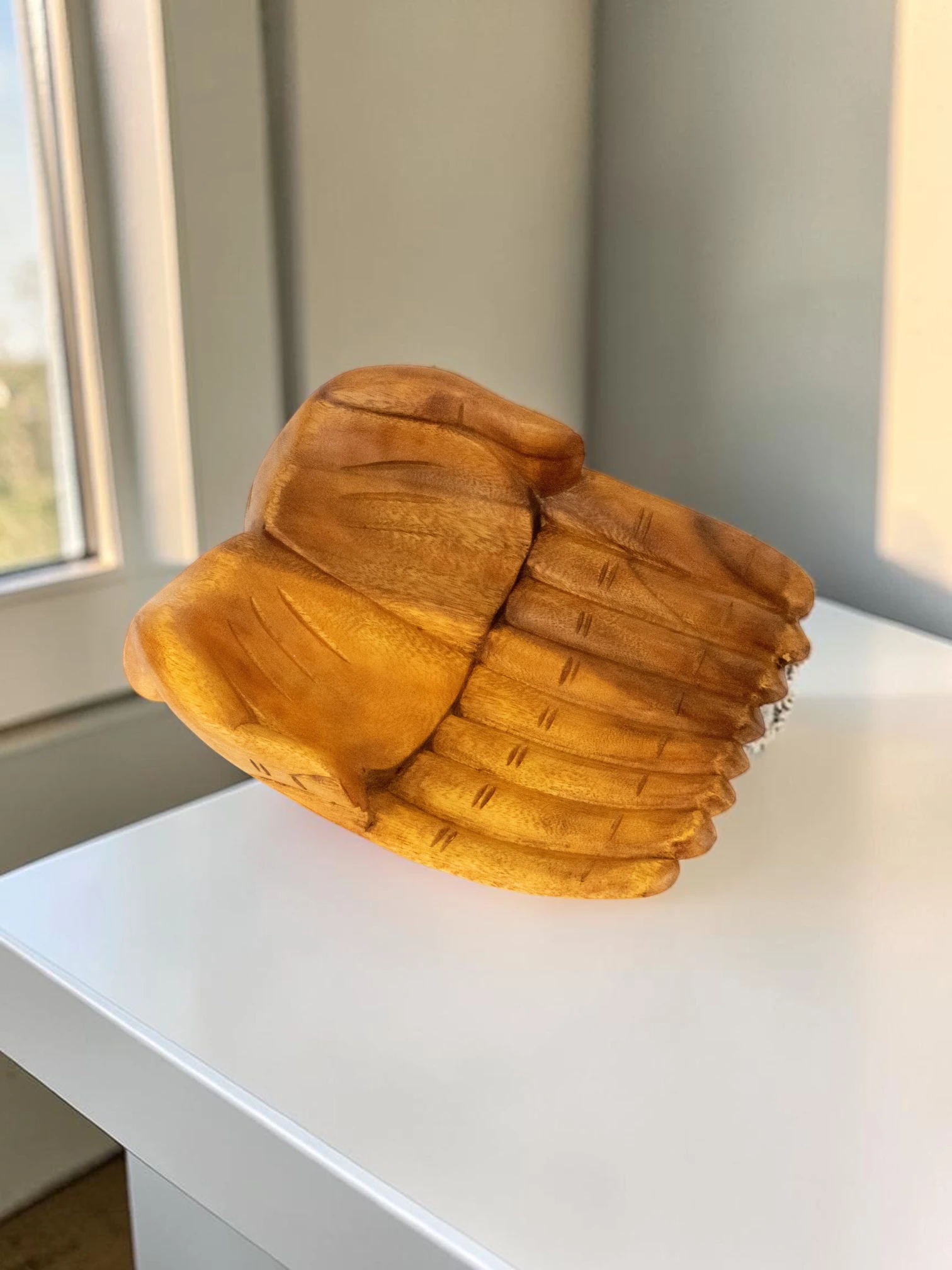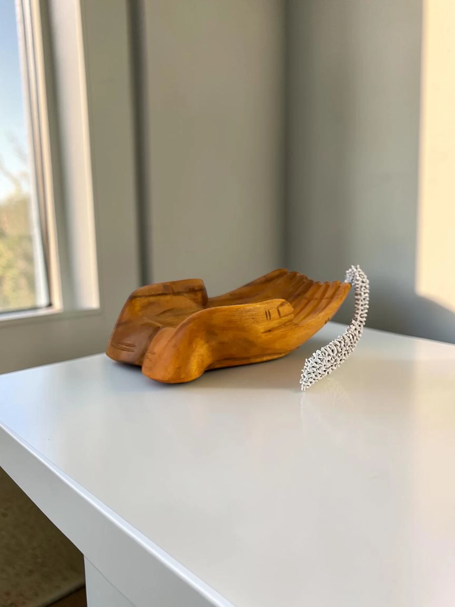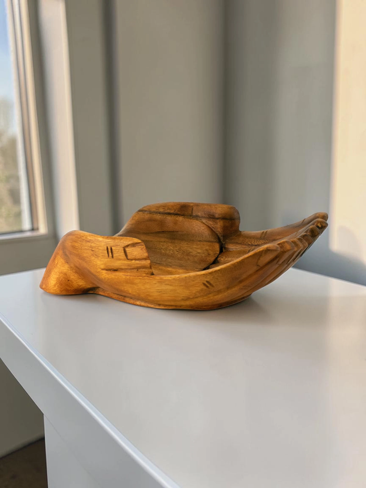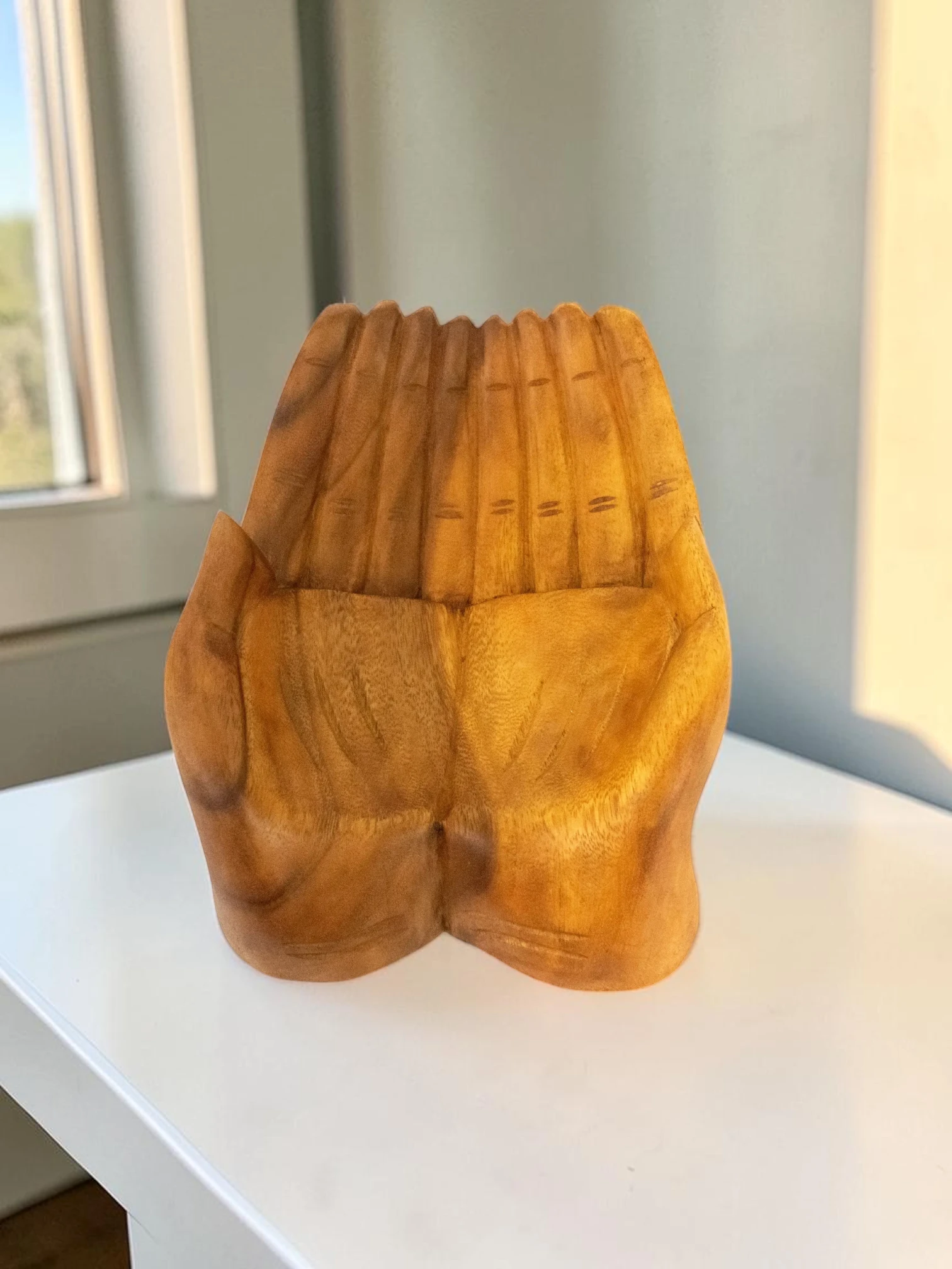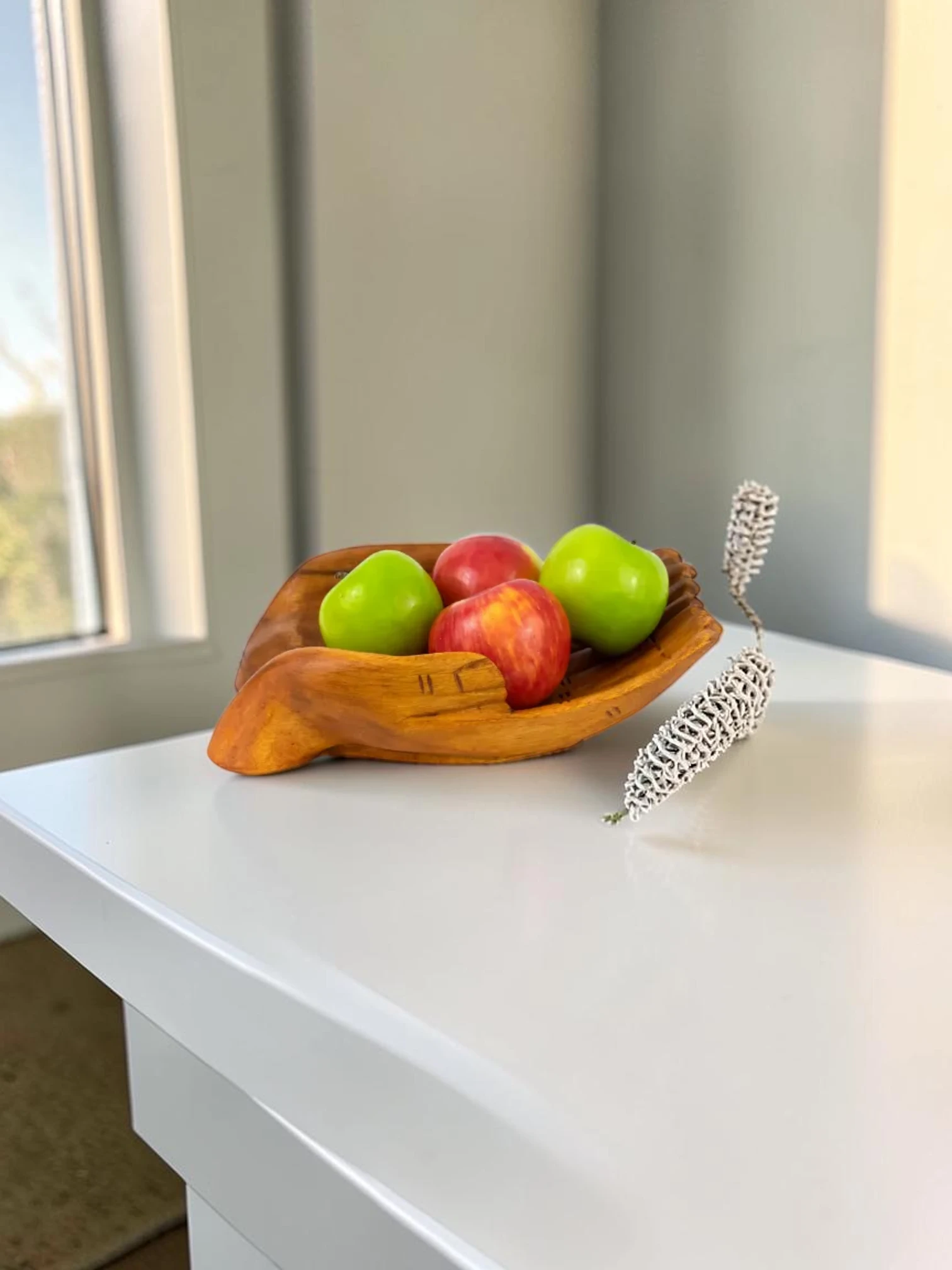 Transform your living space with this striking 12-inch hand-carved wooden bowl. Designed in the shape of two gentle, cupped palms, this piece serves as both a functional kitchen essential and a captivating conversation starter. Whether displayed on your dining table, kitchen island, or entryway console, its organic form brings a warm, artisanal touch to any interior style.