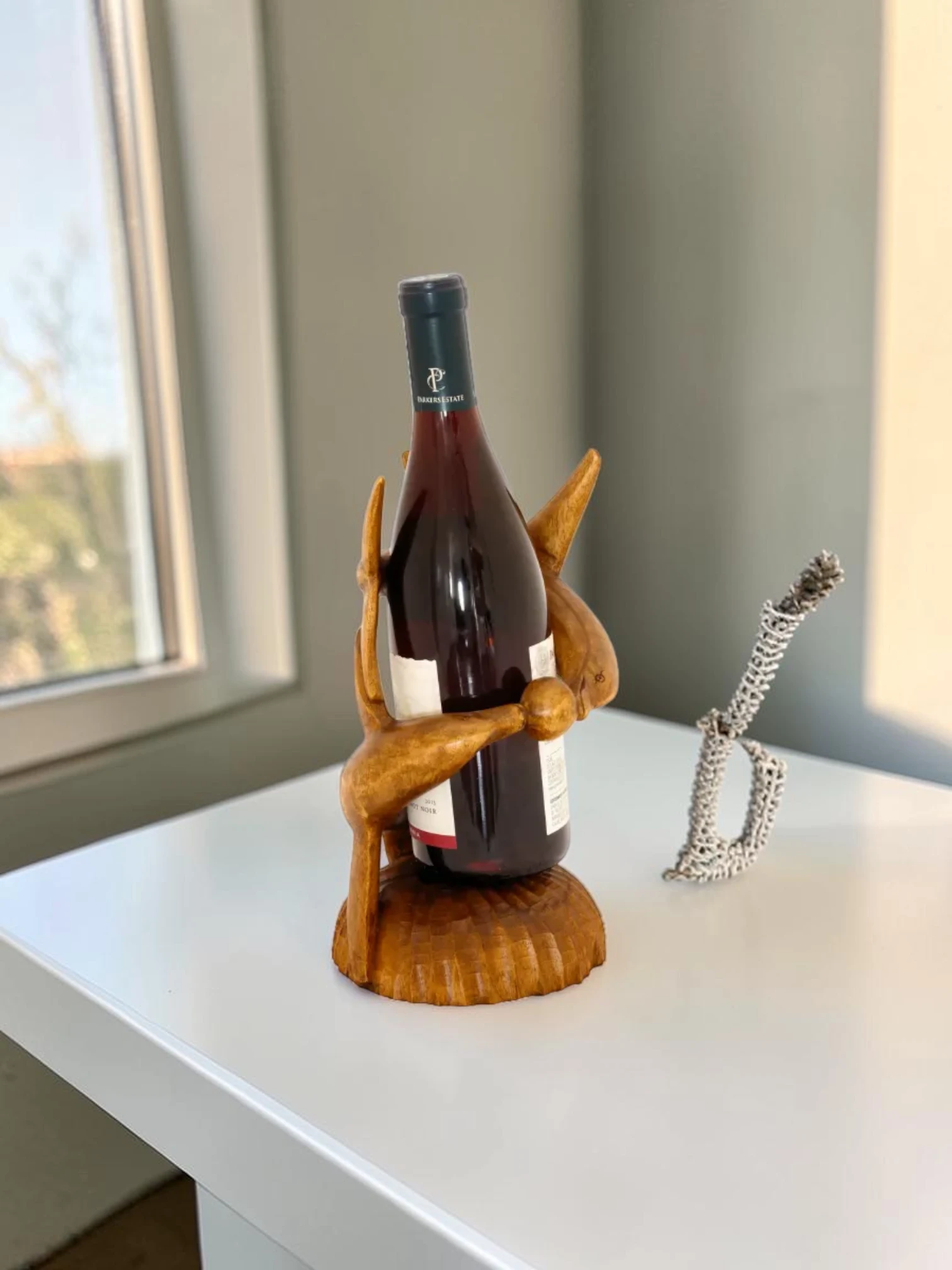 Elevate your home bar or kitchen counter with this exquisite, hand-carved wooden wine holder. Designed to capture the playful spirit of two dolphins, this piece seamlessly blends functional storage with rustic artistic charm. Whether you are a dedicated oenophile or simply looking for the perfect accent for your coastal-themed cabin, this dolphin sculpture provides a secure and elegant home for your favorite 750ml vintage.