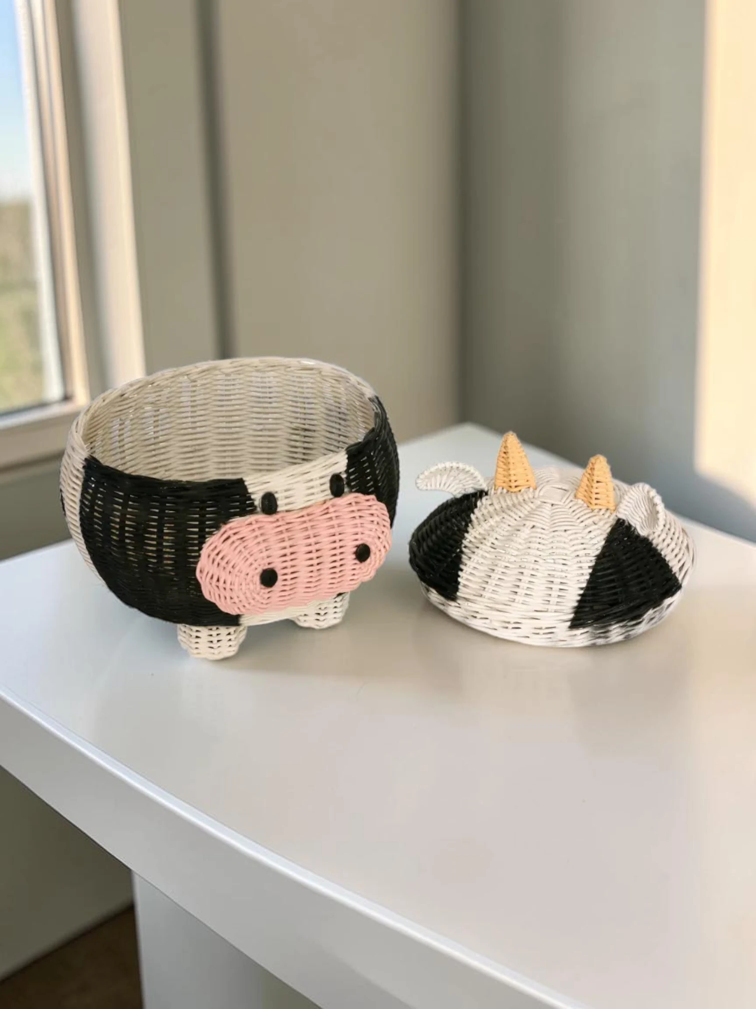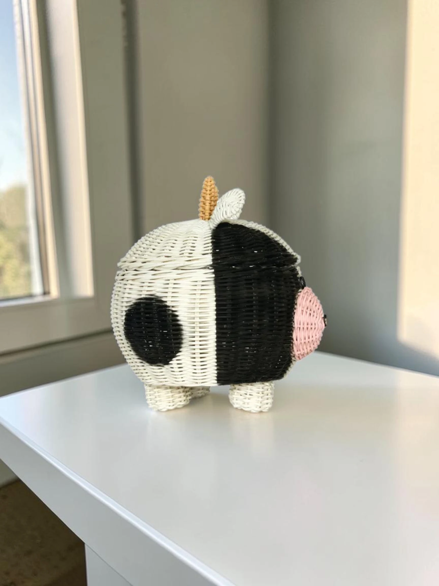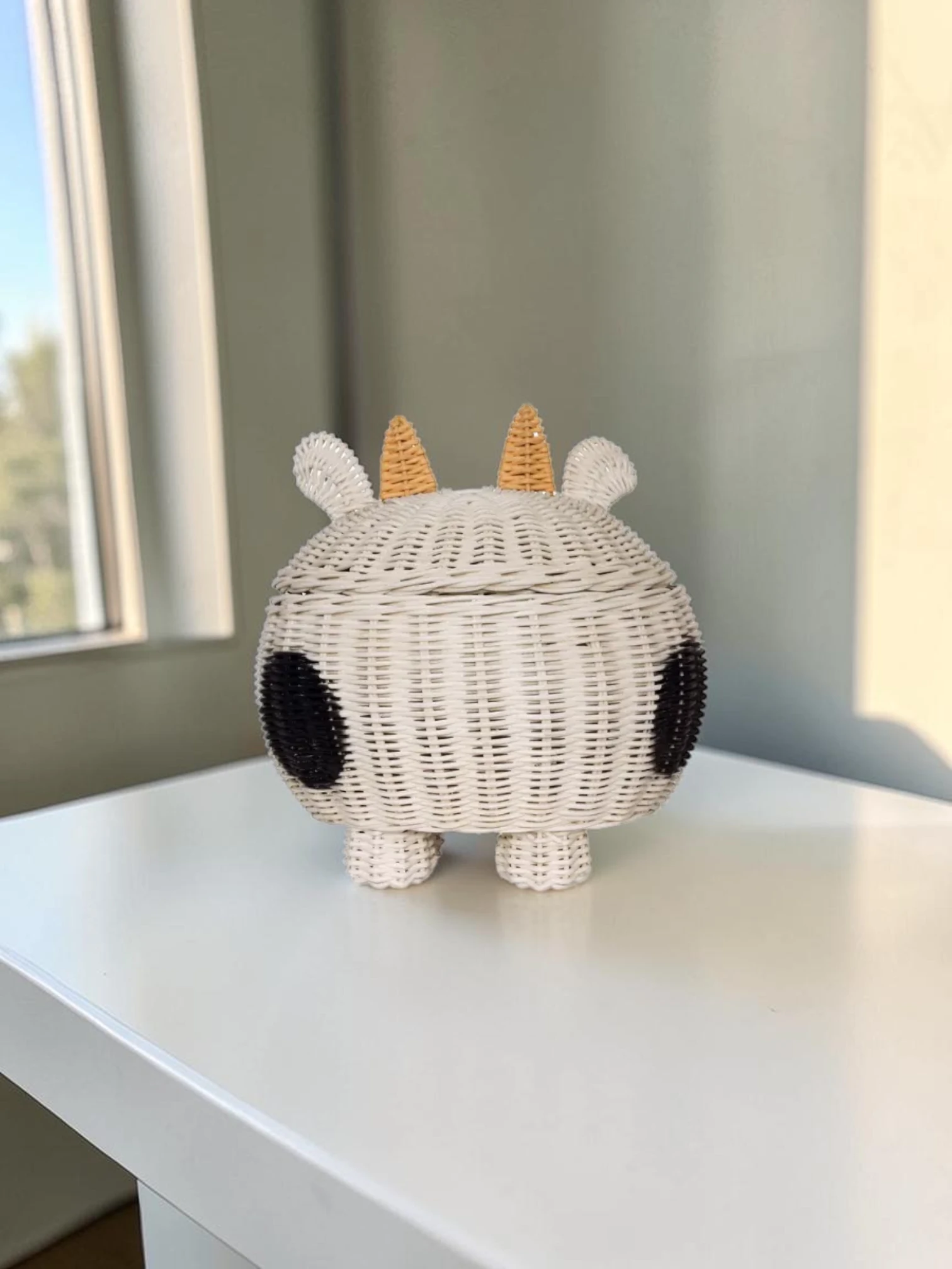 Transform your living space from chaotic to curated with our charming, hand-woven cow storage basket. Designed for those who appreciate the intersection of whimsical decor and functional organization, this basket is crafted from high-quality, natural rattan. Unlike mass-produced plastic alternatives, our basket offers a rich, organic texture that adds warmth and character to any tabletop, shelf, or nursery.